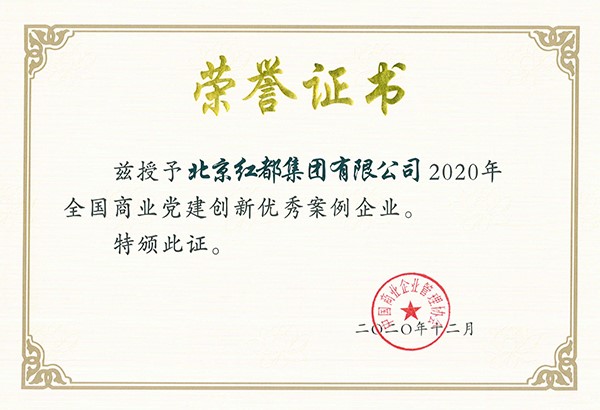 2020年北京红都集团有限公司充分发挥党建在企业创新发展中的重要引领作用,促进了企业高质量发展。经中国商业企业管理协会评选和专家审定,北京红都集团有限公司被授予“2020年全国商业党建创新优秀案例企业”称号,全国10家企业获此荣誉称号。